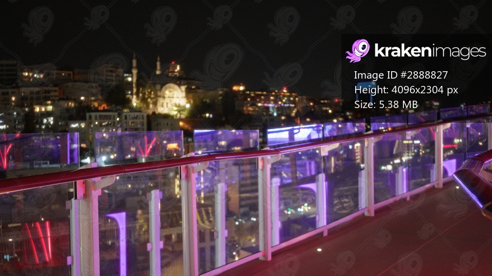 Night rooftop terrace glass balustrade in sharp foreground with blurred urban skyline and colorful bokeh lights, defocused night view city; background backdrop copyspace calm.