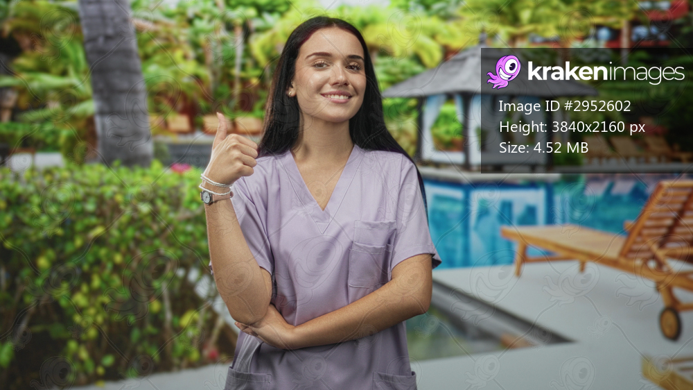 Nurse giving thumbs up gesture at a resort pool wearing lavender scrubs and watch; reassurance wellness care.