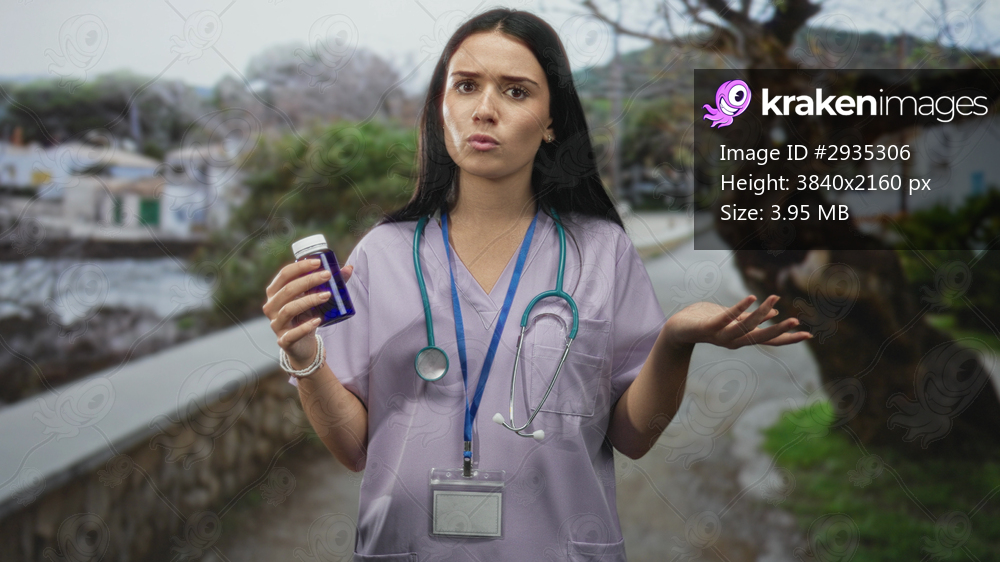 Nurse in lavender scrubs holding blue pill bottle and stethoscope, palms up shrug on street near seaside walkway; uncertainty patient safety.