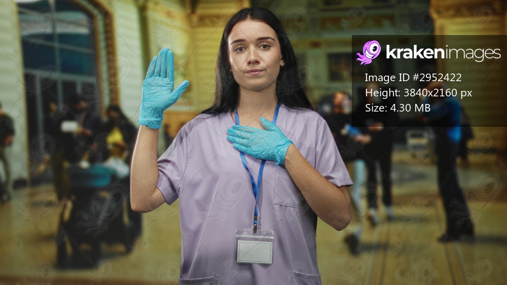 Nurse in purple scrubs with blue gloves raises right hand and places left hand on chest in building; duty compassion healing.