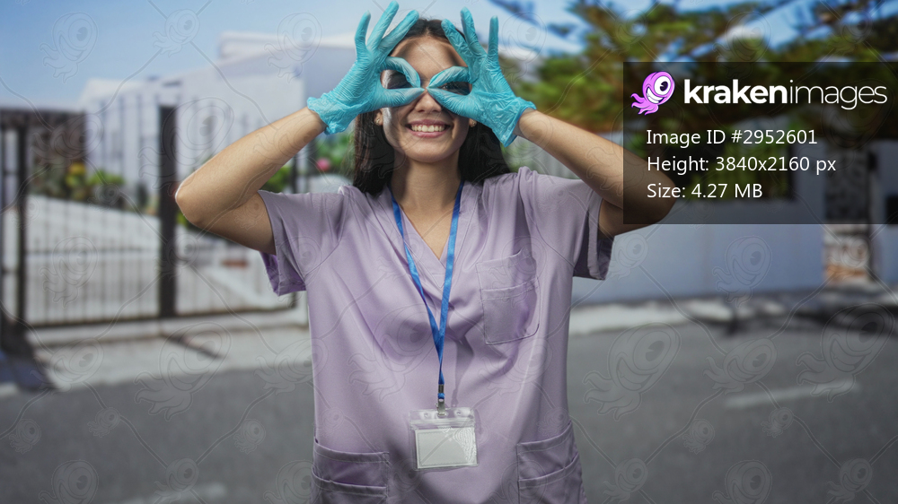 Nurse smiling with id badge and gloved hands making ok circles on a street in front of a gated building; joyful care.