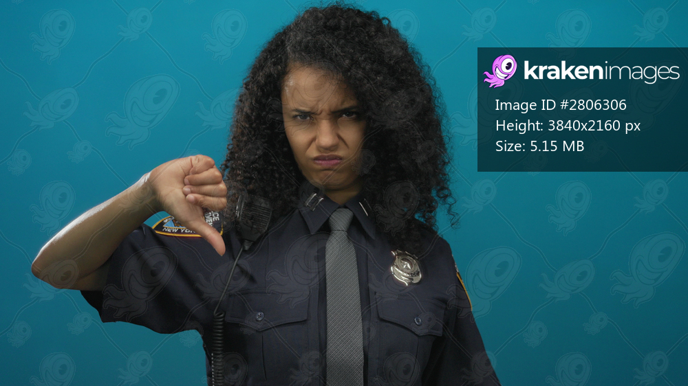 Officer in uniform frowning with thumbs down over blue background, showcasing negative emotion and expression for hispanic policewoman documenting dissatisfaction. - Kraken Images