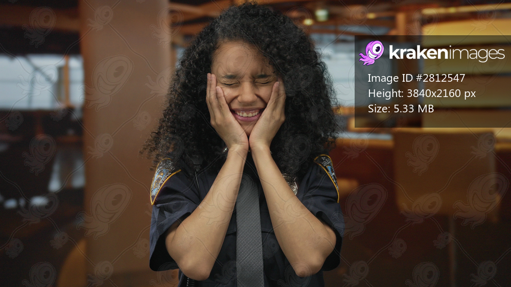 Officer smiling warmly in hotel lobby showcasing professional uniform setting vibrancy indoors woman police smiling confident young curly energy