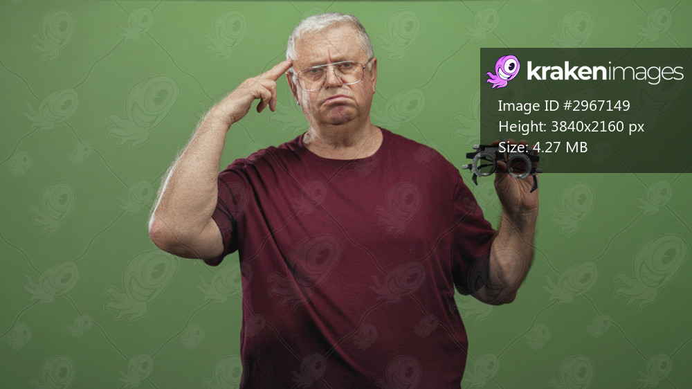 Older man holding phoropter and eyeglasses points finger to temple in studio, holding trial frame and wearing maroon tshirt; thoughtful doubt.