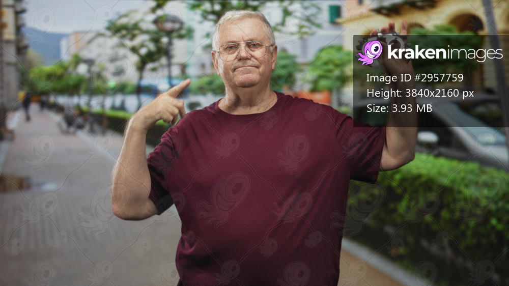 Older man wearing eyeglasses and a maroon shirt holds optometry trial frames and points to his temple on a street; vision concern.
