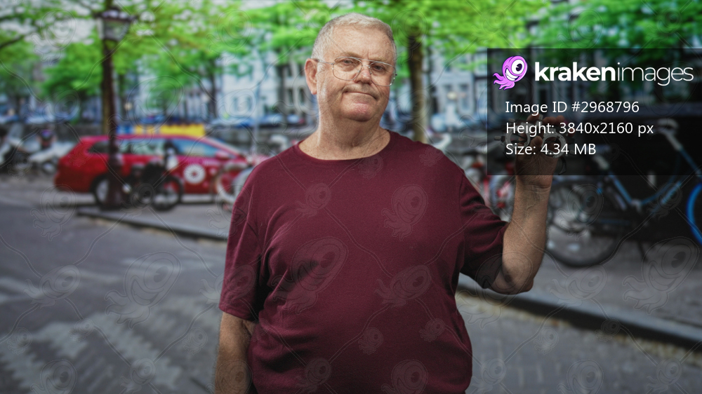 Older man wearing glasses holds optometry trial frame in right hand on a city street; vision care curiosity.