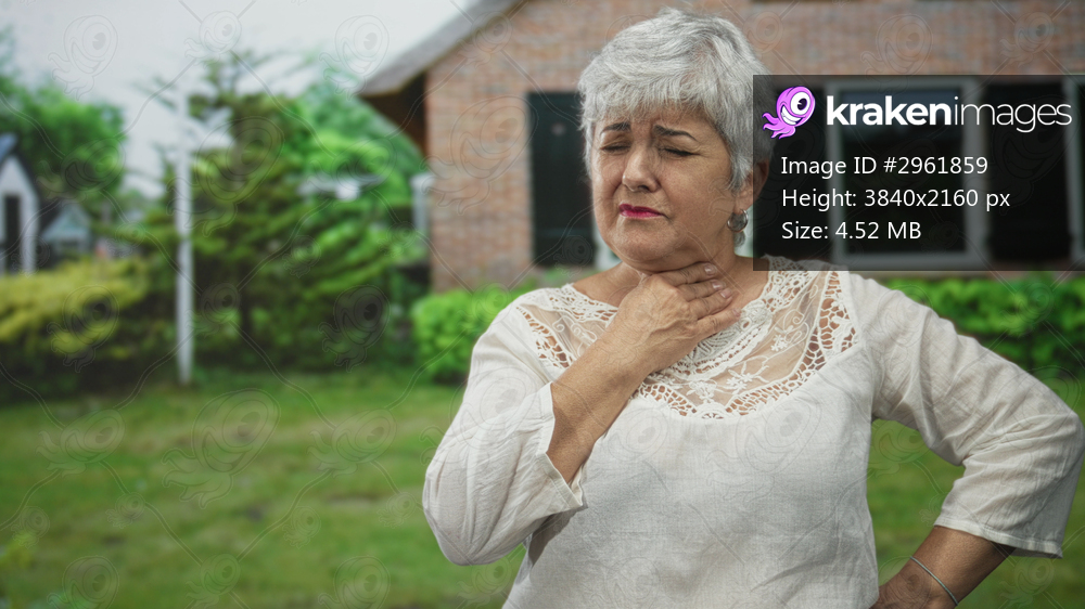 Older woman with grey hair and hoop earrings holding throat with one hand and clutching abdomen with the other, signs of choking or indigestion in front of building; anxiety health warning. - Kraken Images