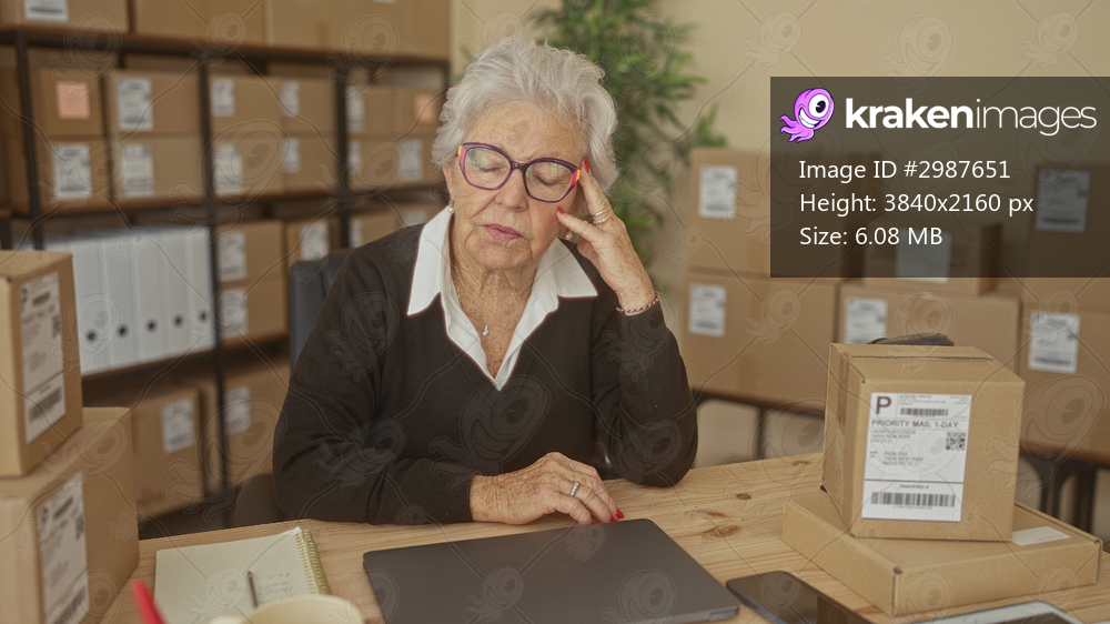 Older woman with hand on forehead beside stacked shipping boxes, laptop and notebook in a small business building; stress and resolve.