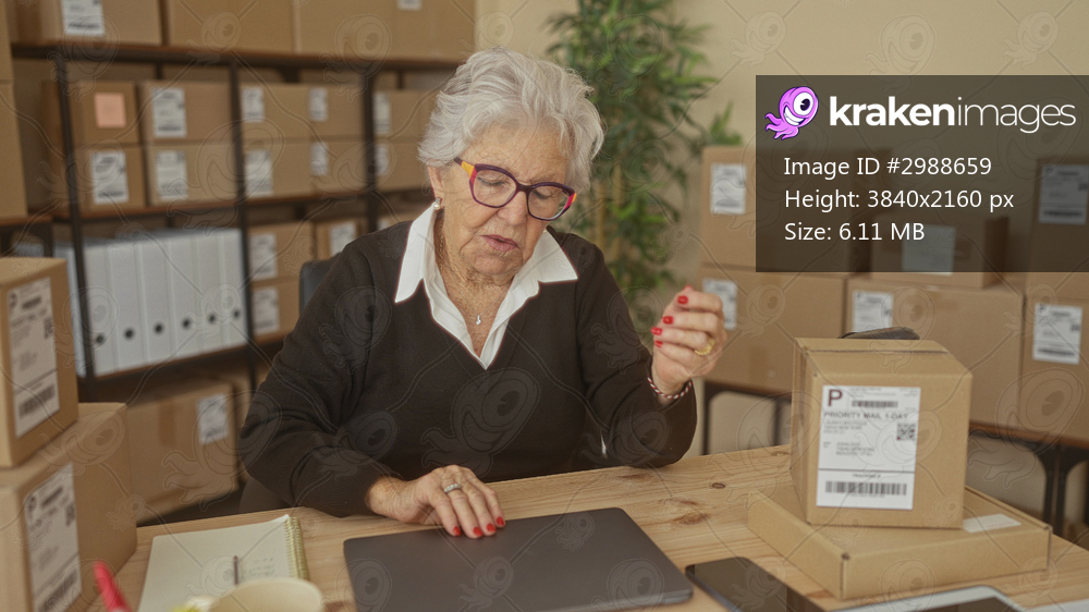 Older woman with hand on forehead beside stacked shipping boxes, laptop and notebook in a small business building; stress and resolve.