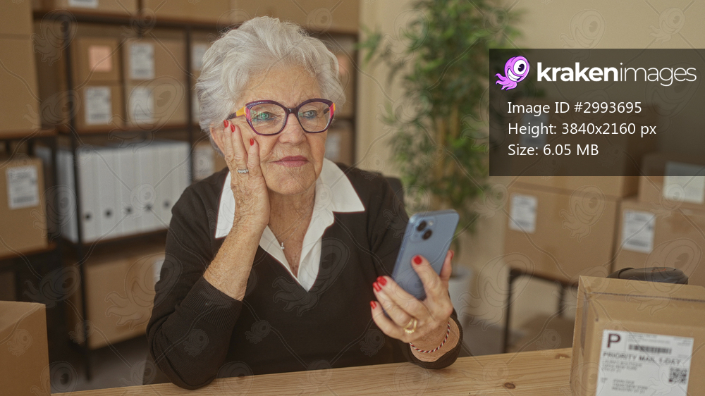 Older woman holding smartphone, hand on cheek in packing building among boxes and scanner; concern toothache perseverance.