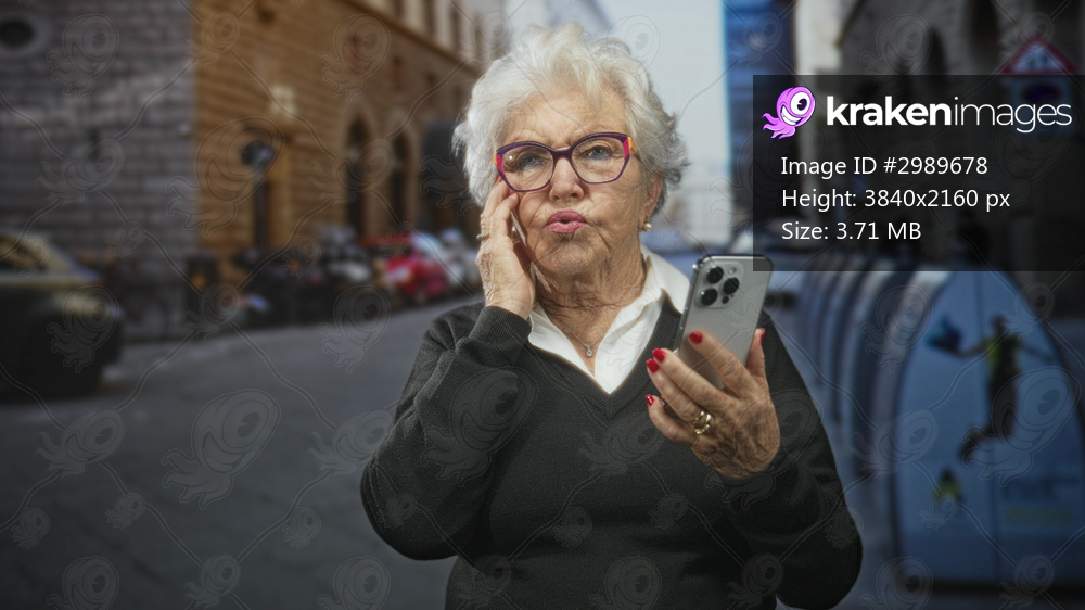 Older woman holding smartphone and touching cheek while adjusting glasses on a narrow historic city street lined with stone buildings and parked cars; concern. - Kraken Images