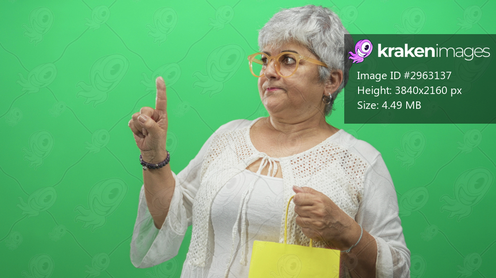 Older woman pointing finger and holding a yellow shopping bag in a studio with green backdrop and chunky glasses; disapproval warning.