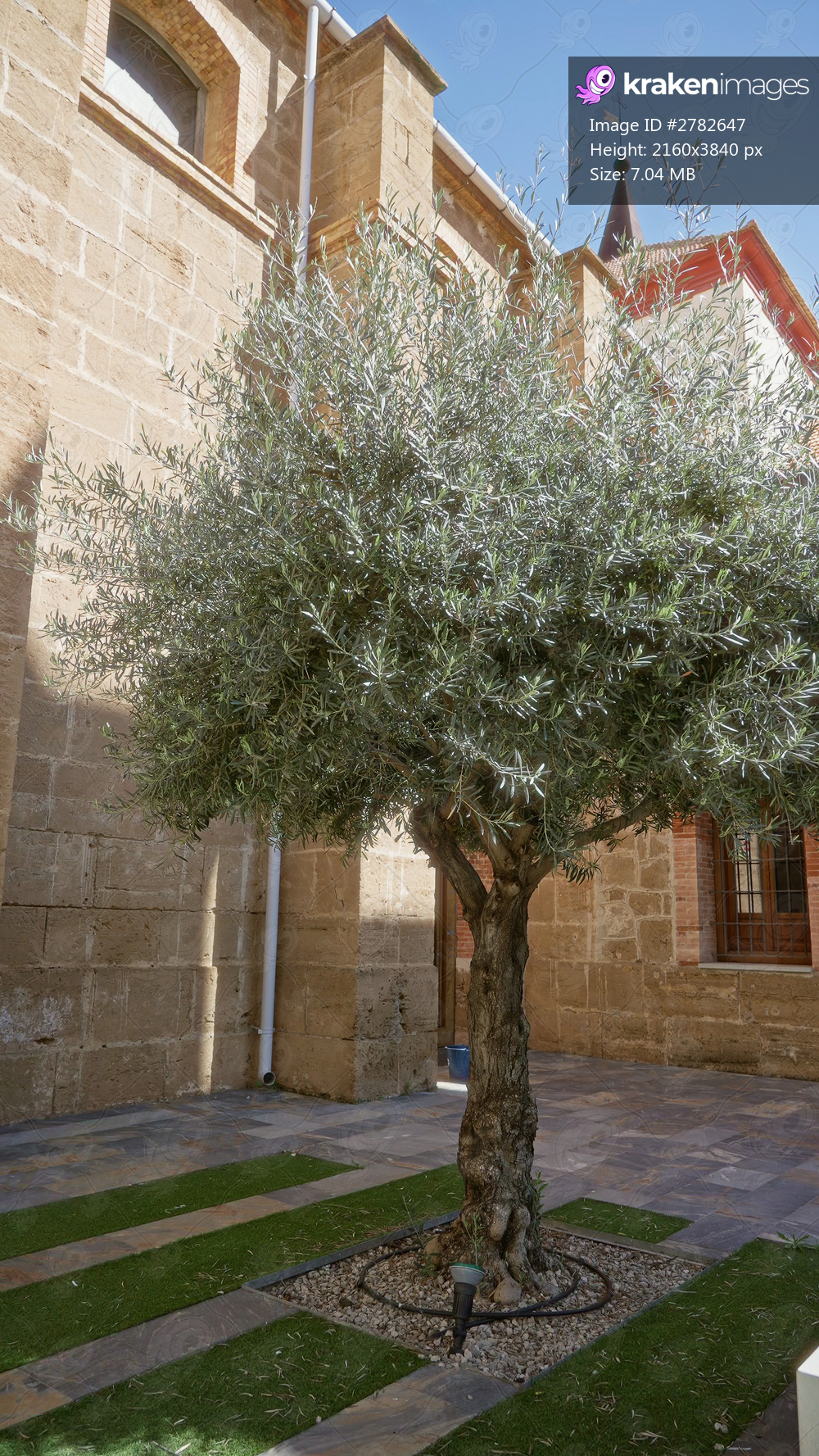 Olive tree with thick trunk in a sunlit courtyard surrounded by stone walls in torrevieja, spain, illustrating mediterranean architecture and landscape. - Kraken Images