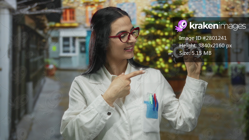 Optician woman in glasses and uniform stands smiling outdoors on a festive street holding optical tool, showcasing professional equipment with confidence and charm. - Kraken Images