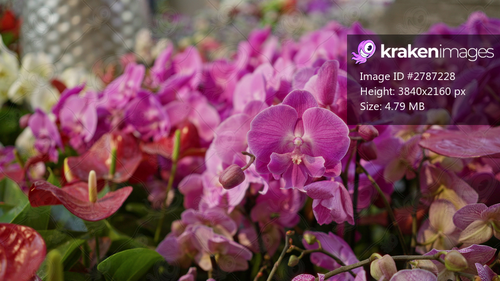 Orchids and anthuriums flourishing outdoors in a vibrant display in the netherlands garden, showcasing lush pink, red blooms under natural lighting accentuating their elegance. - Kraken Images