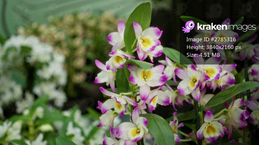 Orchids blooming vibrantly with pink and white petals in an outdoor garden setting in the netherlands.
