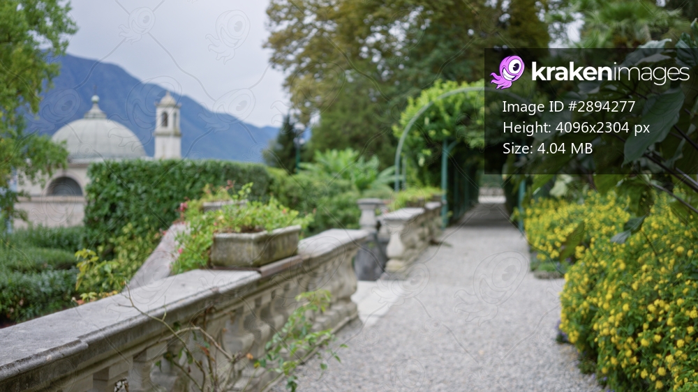Ornamental garden pathway with defocused balustrade and distant dome in soft bokeh garden; background backdrop copyspace calm.