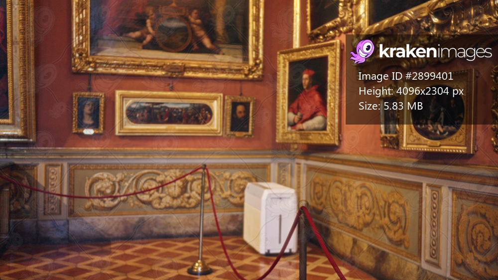 Ornate framed paintings and gilded wall panels softly defocused in an interior gallery; background backdrop copyspace calm.