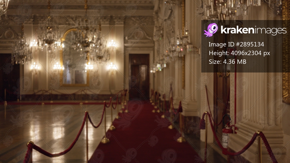 Ornate museum corridor with red carpet, chandeliers and rope stanchions in soft defocused bokeh; background copyspace backplate template.