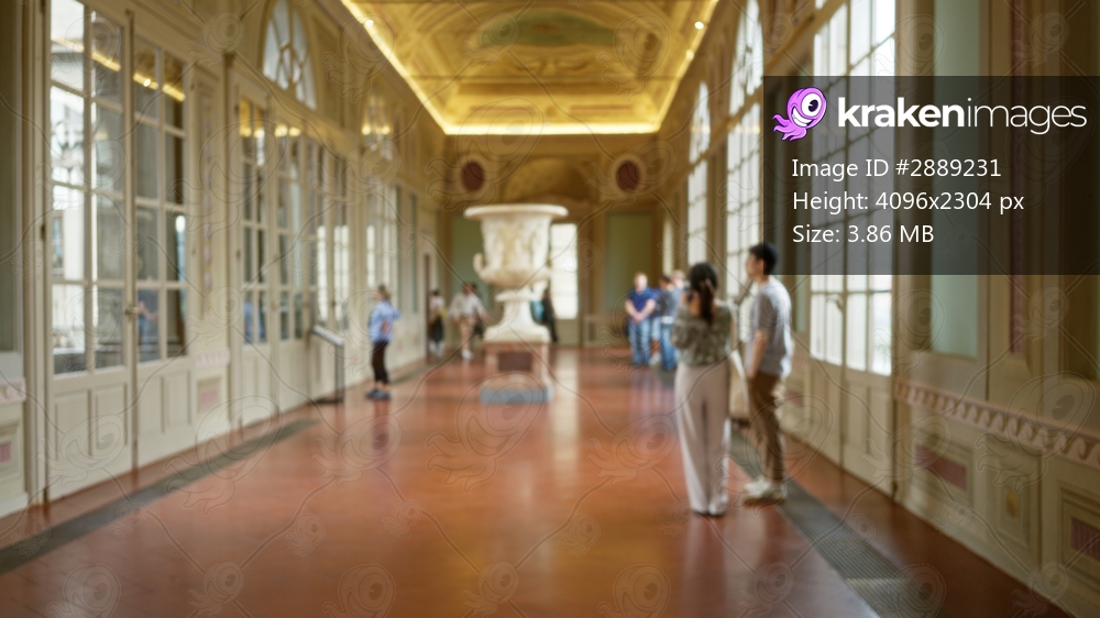 Ornate museum gallery corridor with defocused shallow bokeh, vaulted gilded ceiling and distant urn sculpture, softly blurred windows and terracotta floor, museum; background backdrop copyspace calm.