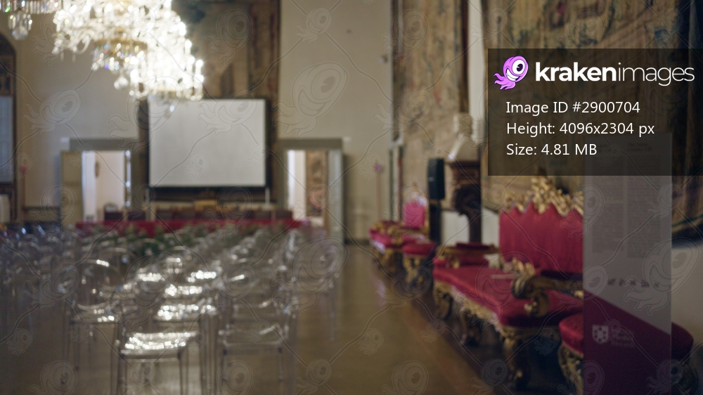 Ornate museum gallery interior with chandeliers, red velvet seats and projection screen, softly defocused bokeh gallery; background backdrop copyspace calm.