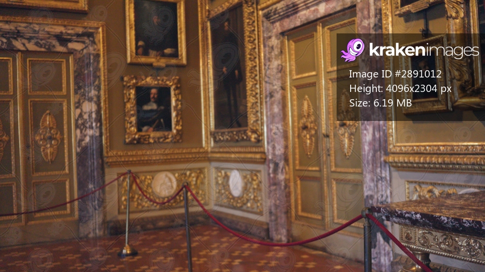 Ornate museum interior in shallow bokeh with defocused gilded frames, velvet ropes and marble details; background backdrop copyspace calm.