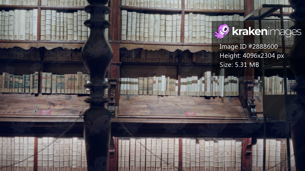 Ornate wooden baluster and historic book stacks on aged shelving in soft shallow bokeh interior; background backplate copyspace.