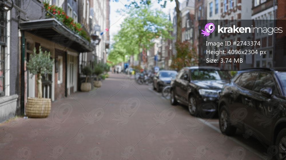 Out-of-focus amsterdam street scene with blurred buildings and parked cars under green trees in a bokeh effect, showcasing urban life in the netherlands. - Kraken Images