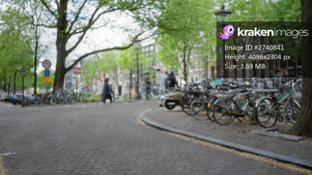 Out-of-focus image of an amsterdam street with blurred people and bicycles under lush green trees, capturing the serene urban atmosphere.