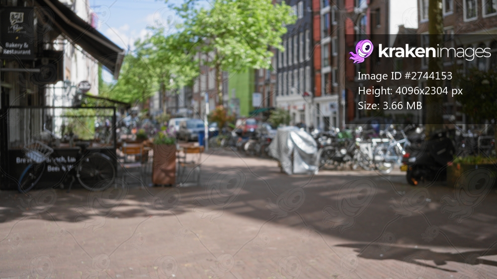 Outdoor scene of european city street showing blurred bicycles, tables, and buildings under bright sunlight exemplifies urban lifestyle.