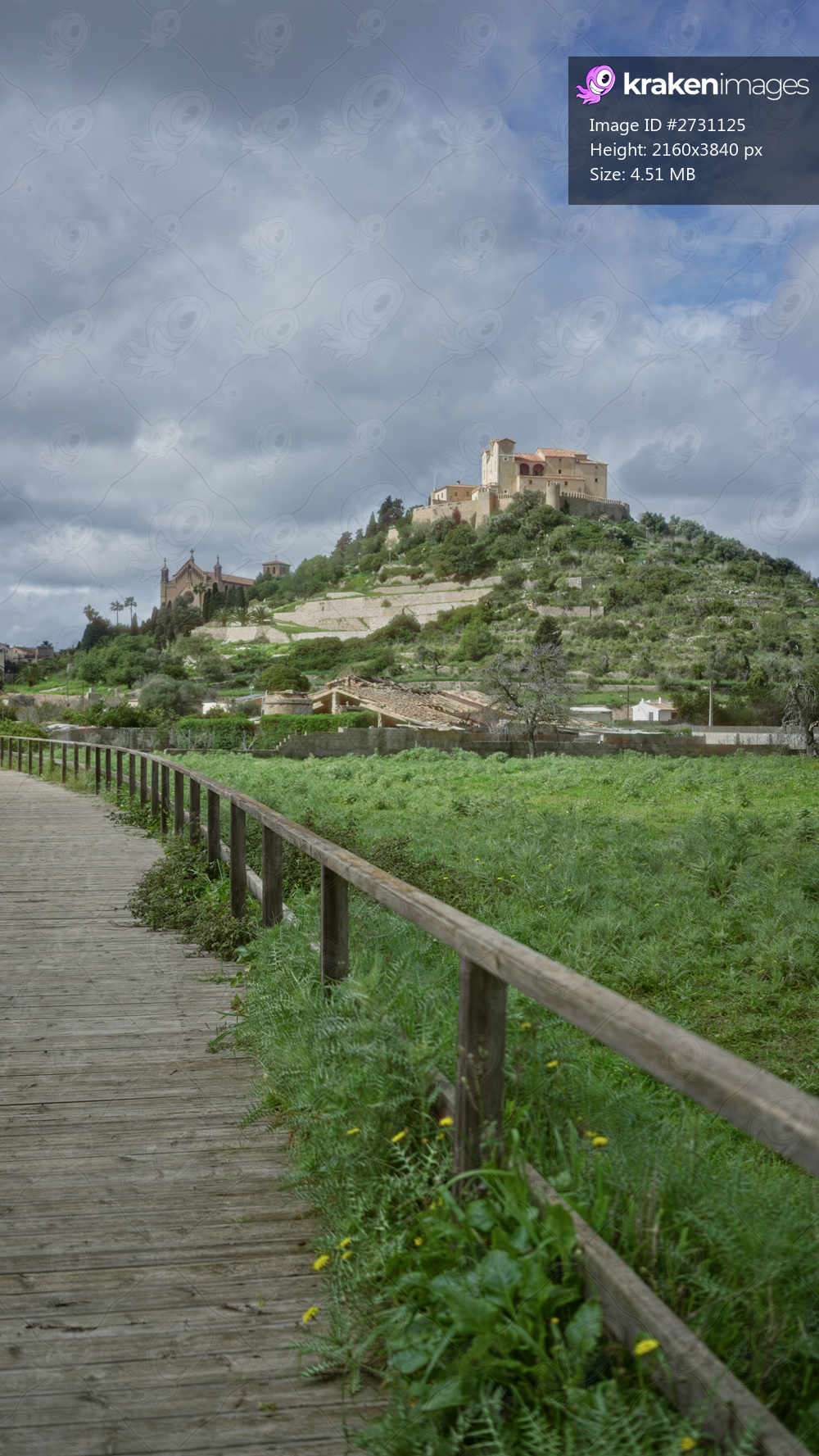 Path leading to a historic hilltop castle in arta, mallorca, surrounded by lush greenery and cloudy skies, showcasing mediterranean landscape and architecture. - Kraken Images