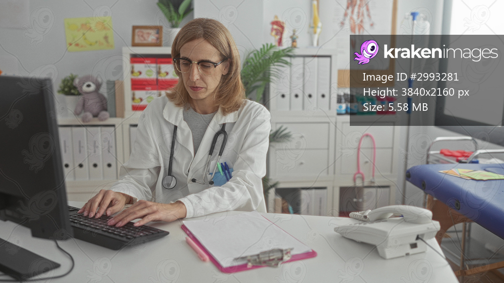 Pediatrician woman typing on keyboard with stethoscope and clipboard at desk in medical exam room inside clinic building; calm attentive care.
