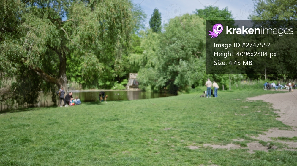 People enjoying sunny day in blurred lush green park with families relaxing near trees and a small pond under a clear sky.