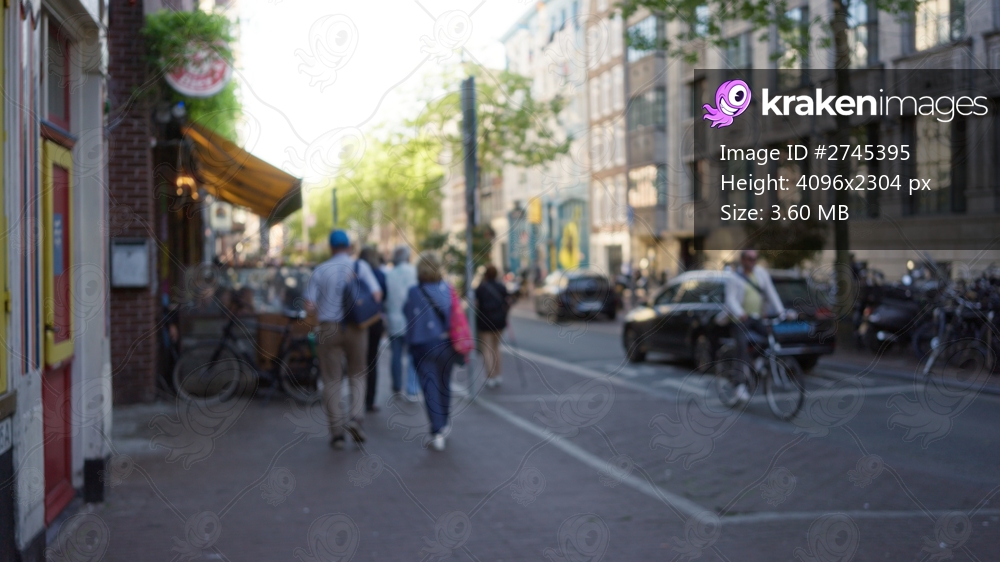 People walking along a defocused european street with bicycles and cars in the background, capturing urban life with blurred buildings and trees under a sunny sky. - Kraken Images