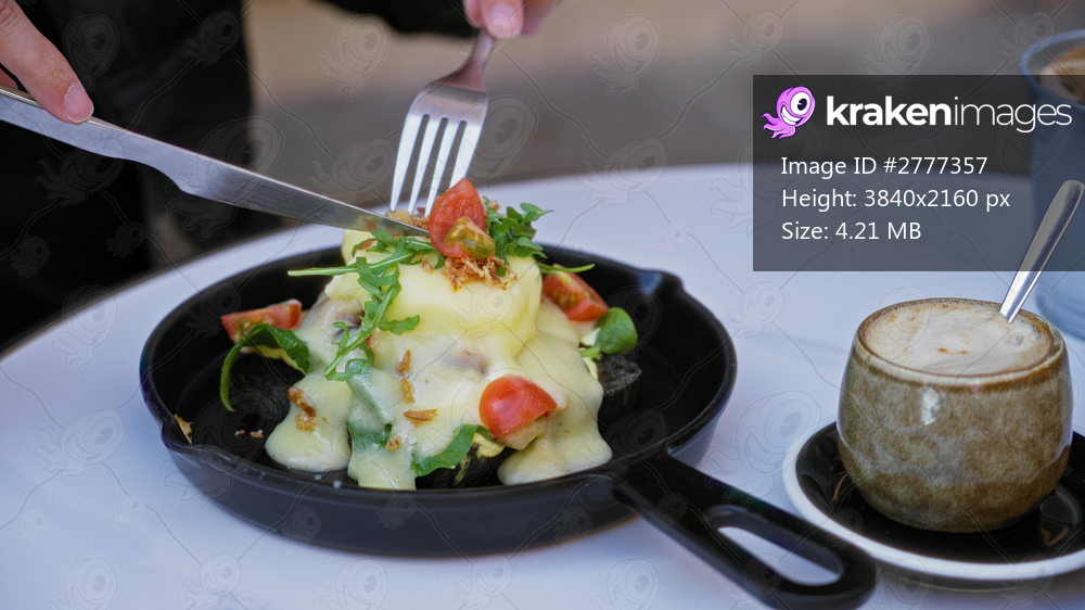 Person enjoying eggs benedict on a table with cappuccino in a sunny cafeteria showcasing vibrant salad and creamy sauce.