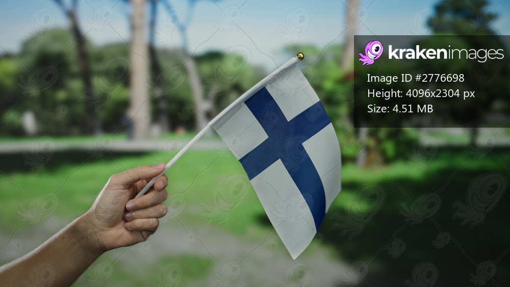 Person holding finnish flag in bright outdoor park setting, showcasing national pride and celebration with blue sky and green scenery in the background. - Kraken Images