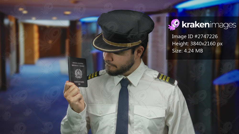 Pilot in uniform holds italian passport in hotel corridor, showcasing travel themes with a focus on identity, aviation, and hospitality interactions.
