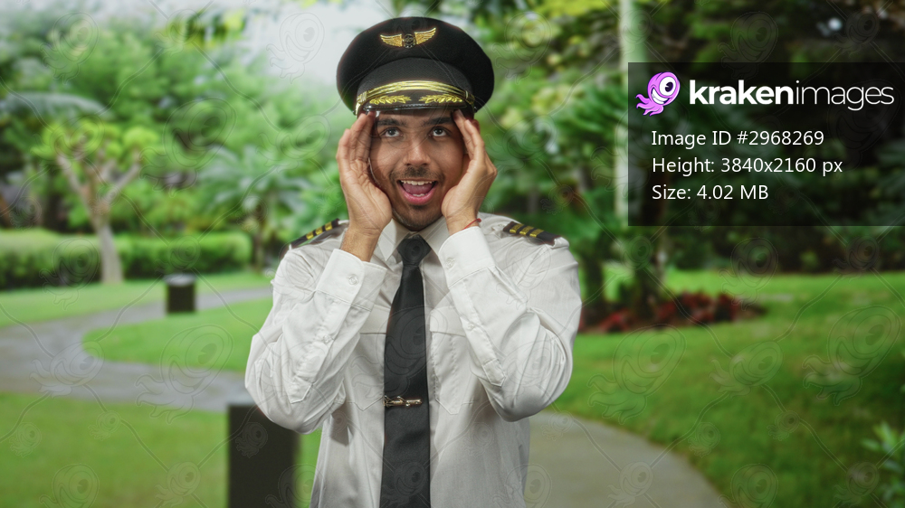 Pilot man in uniform holds hands to temples and peeks through fingers on a forest path, tie clip and winged cap clearly visible; surprise playfulness.