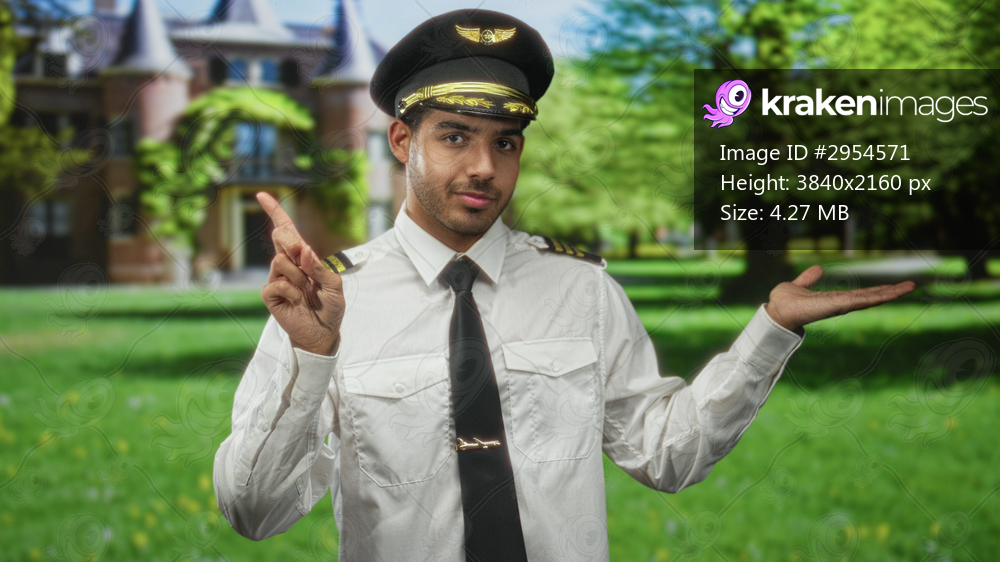 Pilot man in white shirt and black tie wearing captain hat with palms up gesture by epaulettes standing before a brick building entrance; confidence professionalism. - Kraken Images