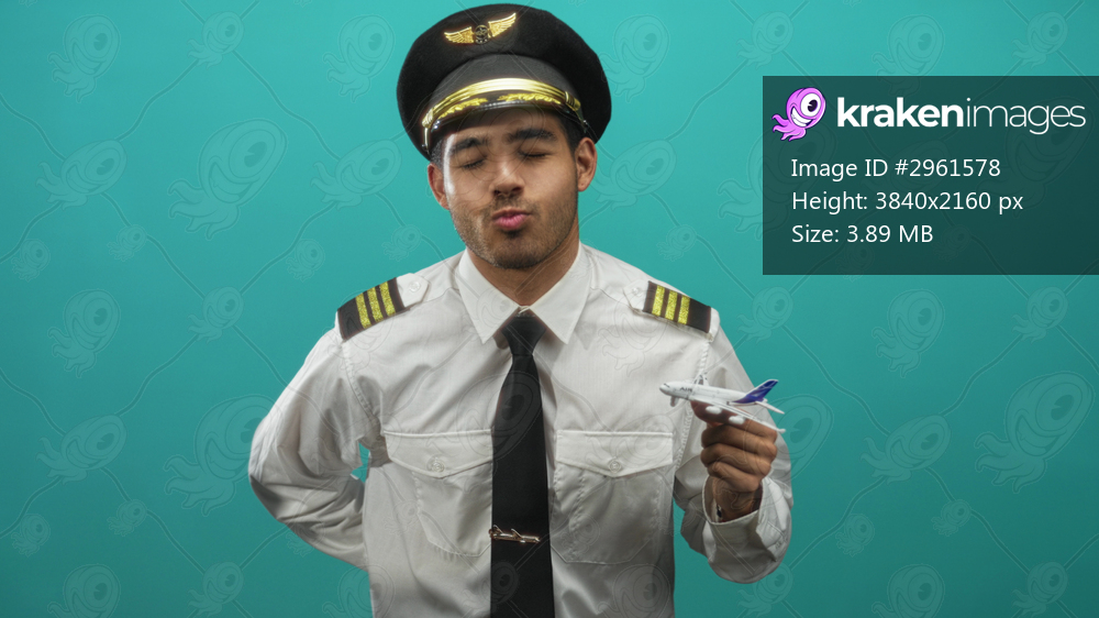 Pilot man in white uniform and captain hat holds a model airplane in his right hand, tilting it upward while smiling and looking at it in studio; dreams pride. - Kraken Images