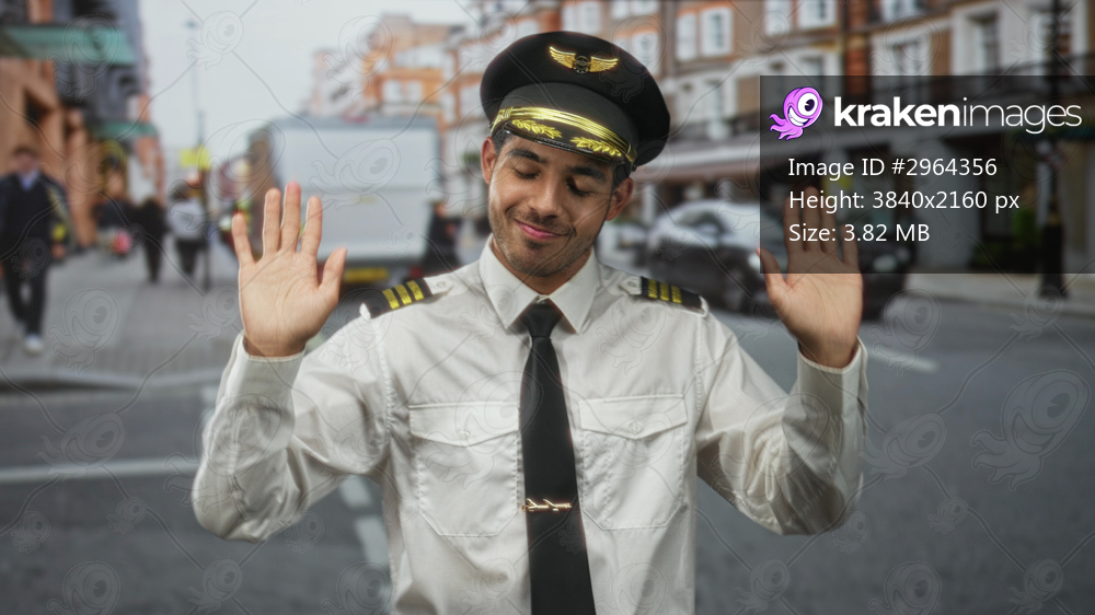 Pilot man raises hands palms visible wearing pilot uniform and cap on a busy city street; joyful greeting.