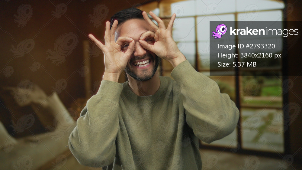 Playful young hispanic man indoors makes glasses gesture with hands in a cozy rustic mediterranean house, smiling joyfully by window with nature view in the background. - Kraken Images