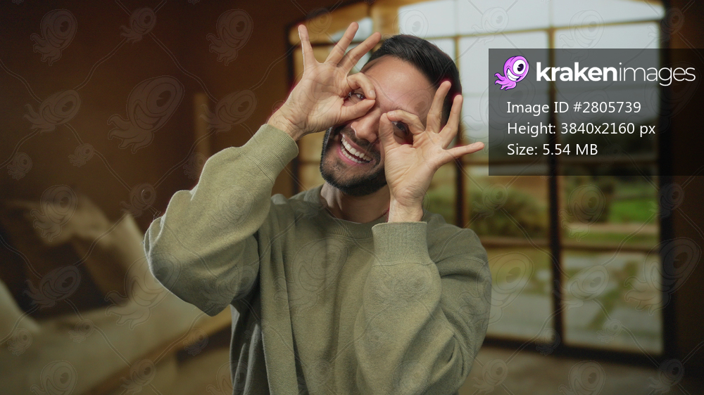 Playful young hispanic man indoors makes glasses gesture with hands in a cozy rustic mediterranean house, smiling joyfully by window with nature view in the background. - Kraken Images