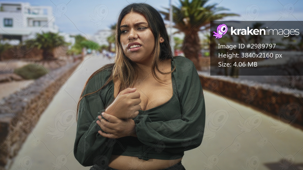 Plus size hispanic woman clutching wrist and grimacing while walking on a sunny street lined with palm trees and white buildings; injury pain.