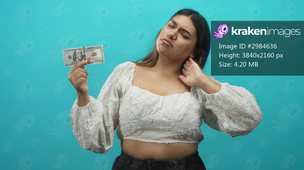 Plus size hispanic woman holding a one hundred dollar banknote, hand touching neck and showing a grimace in studio against turquoise backdrop; frustration doubt value. - Kraken Images