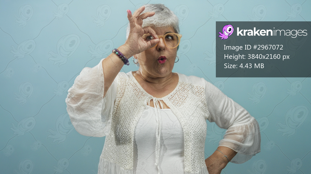 Plus size senior woman with grey hair wearing yellow glasses and white blouse making ok sign over eye with puckered lips in studio; playful curiosity.