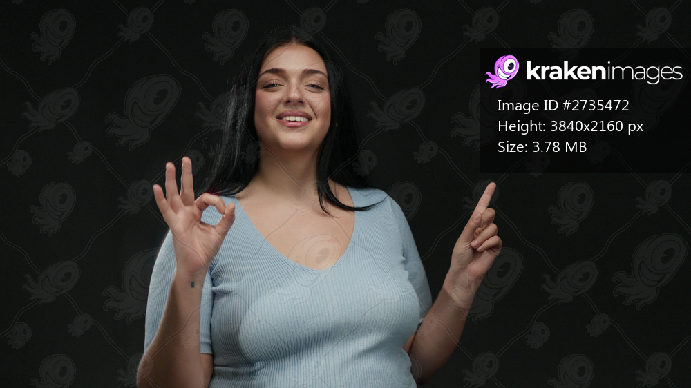 Plus size woman gesturing ok and pointing up against a black background, expressing confidence and positivity with a smile.