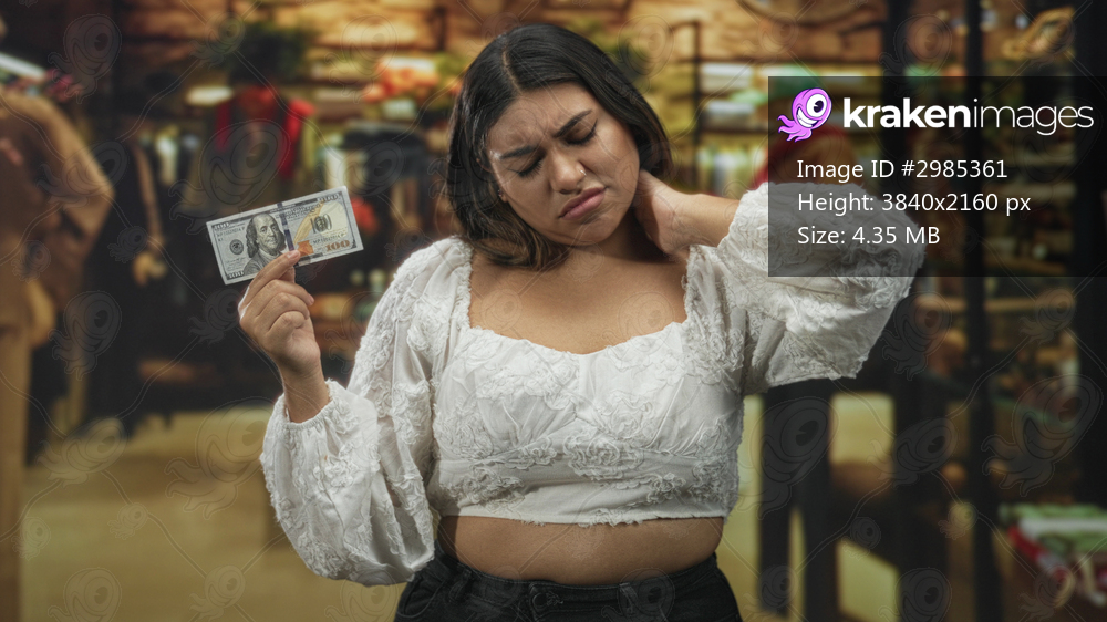 Plus size woman holding a hundred dollar bill while rubbing her neck in a retail building filled with shelves and clothing racks; money concern.
