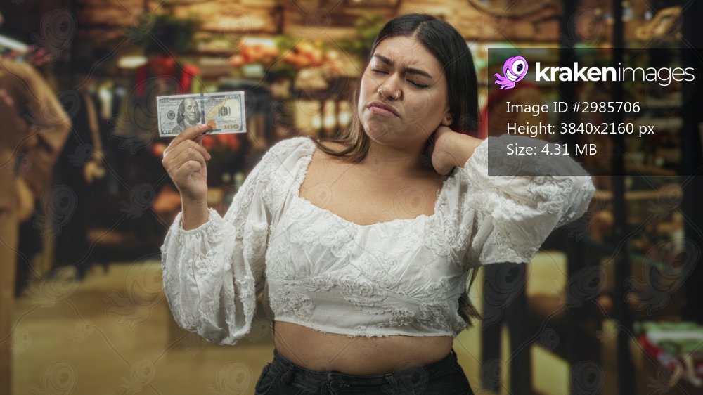 Plus size woman holding a hundred dollar bill while rubbing her neck in a retail building filled with shelves and clothing racks; money concern.