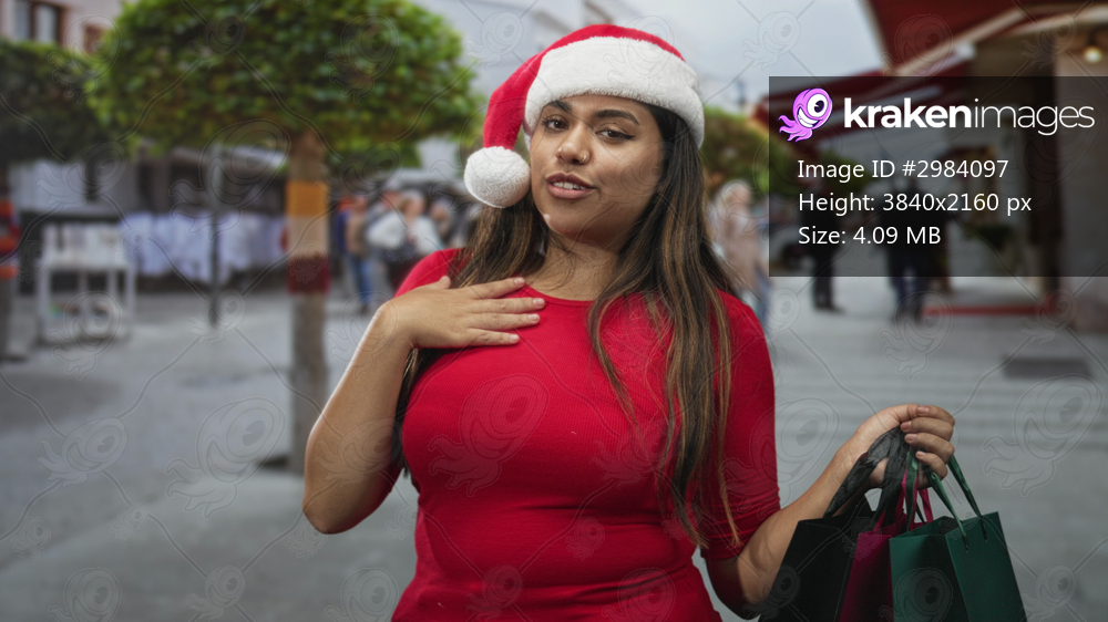 Plus size woman holding shopping bags places hand on chest wearing santa hat on street; holiday joy.